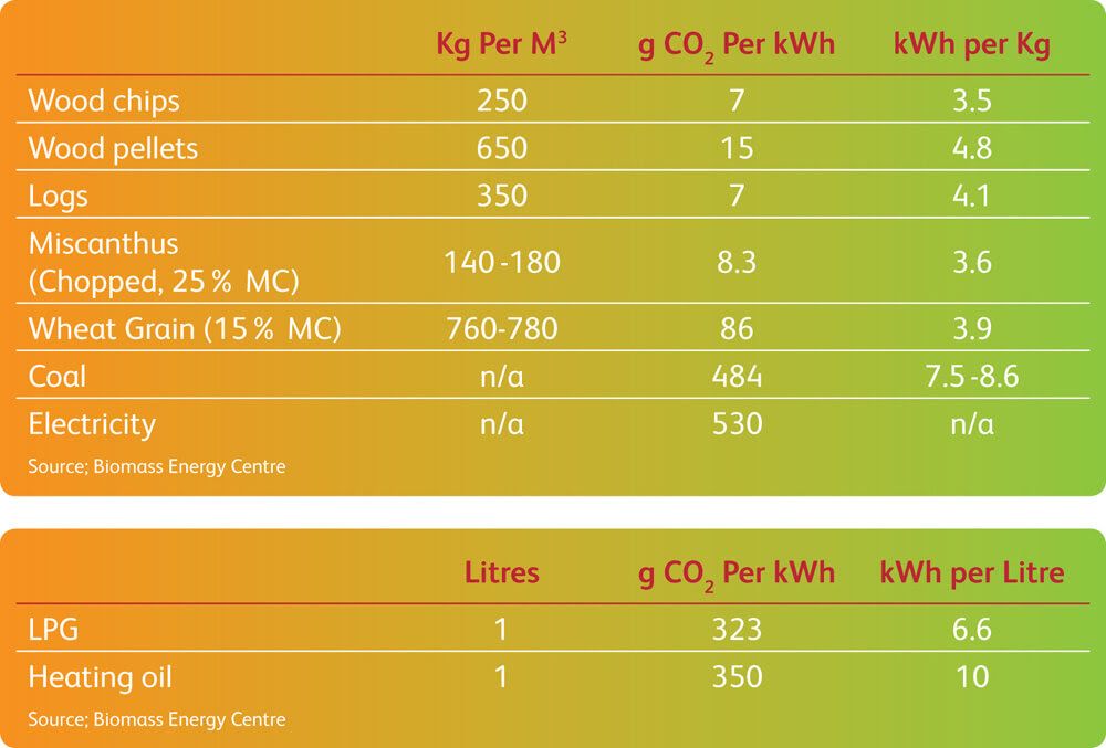 The table below gives an overview of the relative densities per cubic metre, the CO2emitted per kWh of heat generated and how many units of heat  in kWh may be gained from different biomass fuels.